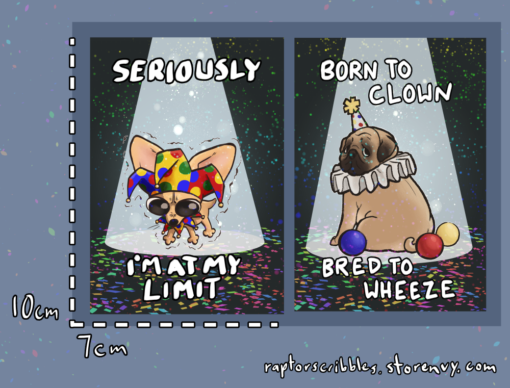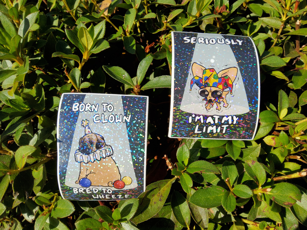 10x7cm holo vinyl stickers of two varieties of miserable clown dog!