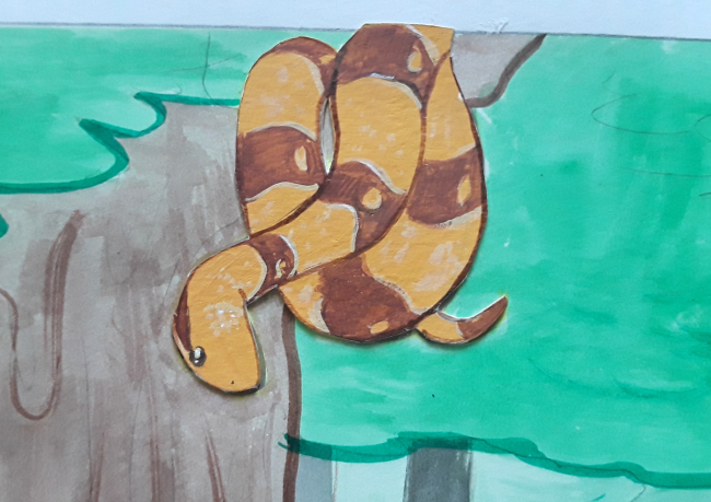 The snake in the foreground was painted on a separate piece of watercolor paper and glued down.