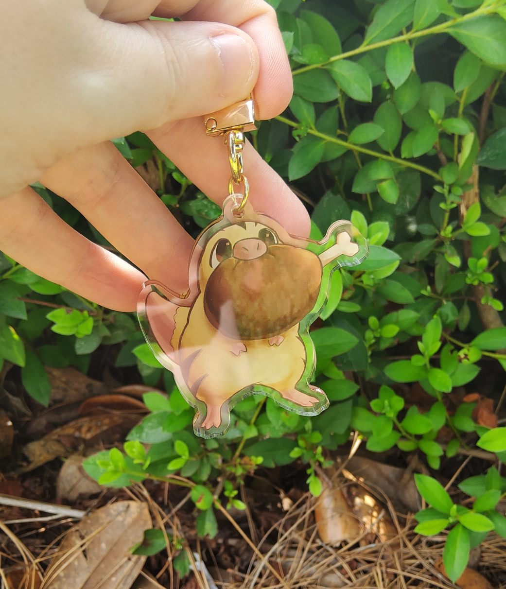 Clear acrylic keychain, about 2.5 inches at its widest point; please note that, while one of the example photos shows a hook clasp, these now ship out with split rings!