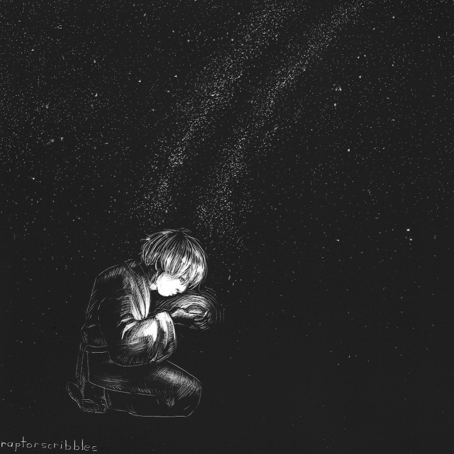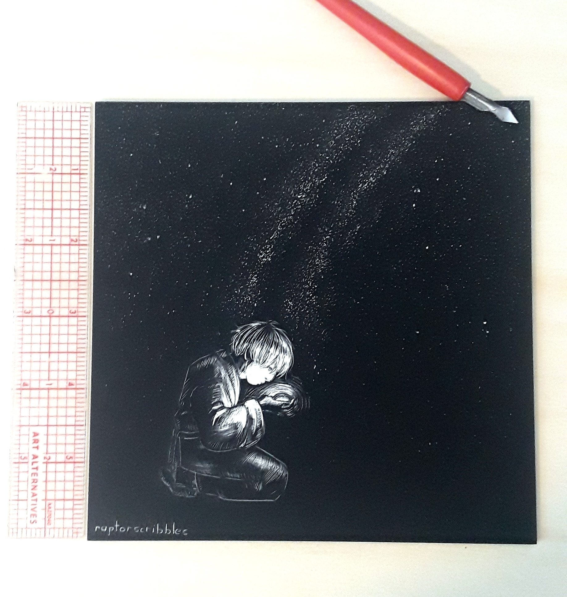 March 2022 illustration inspired by Mushi-Shi; 6x6 scratchboard.